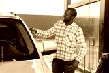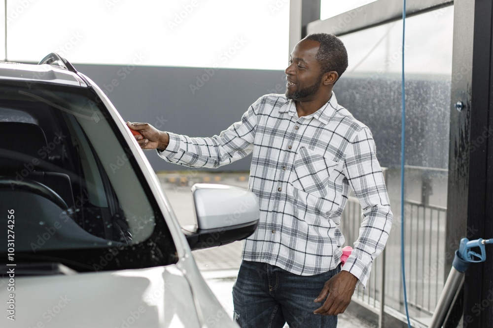 Middle aged black man cleaning his car with a squeegee outside in the car wash