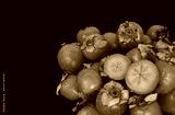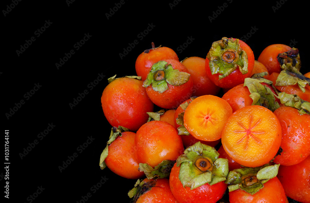 Heap of orange persimmon fruits isolated on black background. Copy space for text.