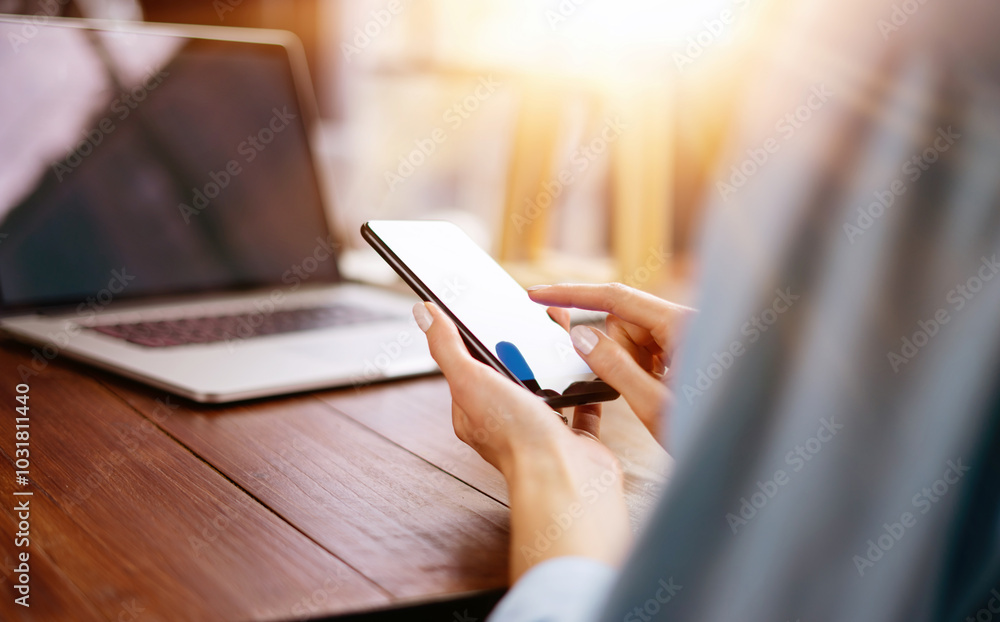 Woman pointing on smartphone screen, chatting in social networks, meeting website, searching internet, sending sms, using text messenger or online banking