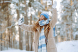 Smiling woman taking selfie and waving hand outdoors in winter park. Concept of blogging, travel, weekend. Active lifestyle.