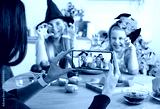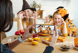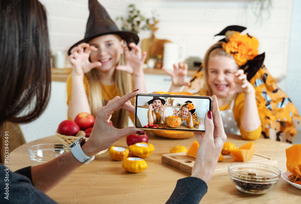 Happy Halloween! Funny girls in witch hats with scary face on pumpkin jack o lantern to set the mood for trick or treaters. Mom takes pictures of children on the phone. Family fun activity.