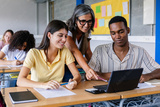 Mid adult female teacher helping diverse high school students in classroom. Education lifestyle concept