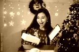 Young woman opening gift box and feeling excited on Christmas day at home