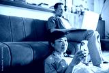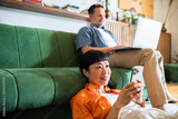 Happy Asian woman using smartphone while relaxing at home with man working on laptop in background