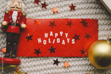 A cheerful holiday greeting reads Happy Holidays surrounded by a nutcracker figurine and colorful star-shaped confetti on a soft knitted blanket.