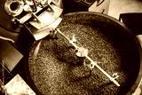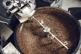 Close up of coffee processing. Roaster, roasting machine and fresh roasted beans