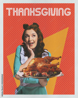 Contemporary art collage. Woman, dressed in retro style, holds Thanksgiving turkey with joyful expression. Retro style, pin-up. Concept of autumn holidays, celebration, harvest season. Ad