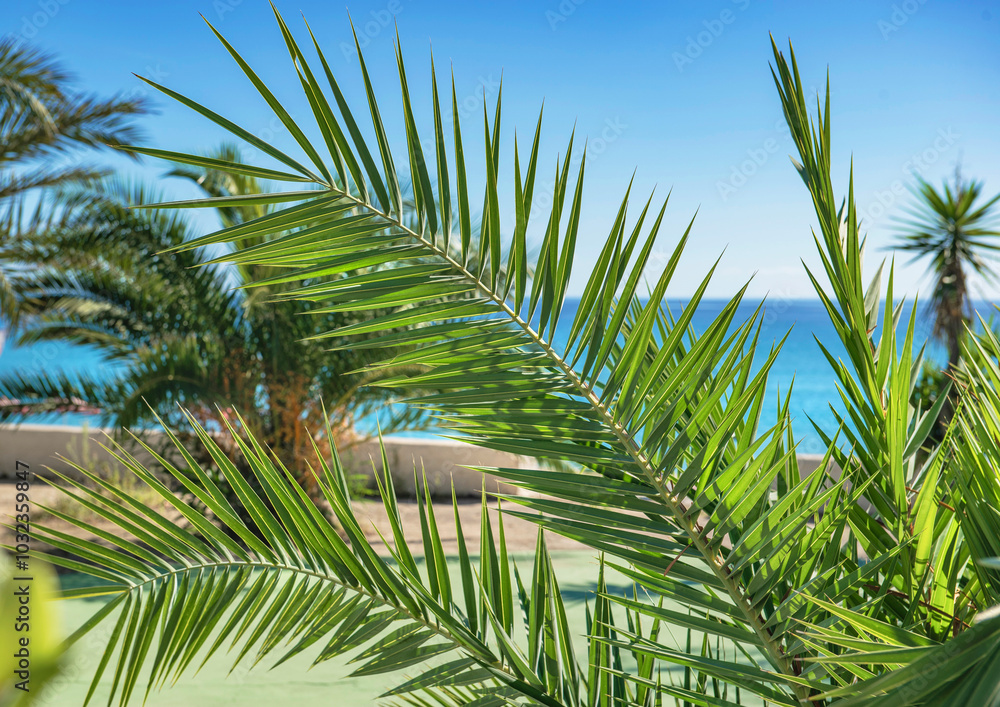 closeup on green leaf of palm tree in front of a beach under blue sky