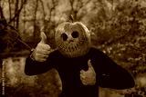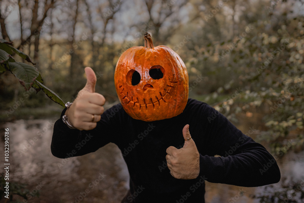Positive man with pumpkin head for Halloween showing thumbs up, like gesture. Jack-o-lantern costume.Trick or treat.