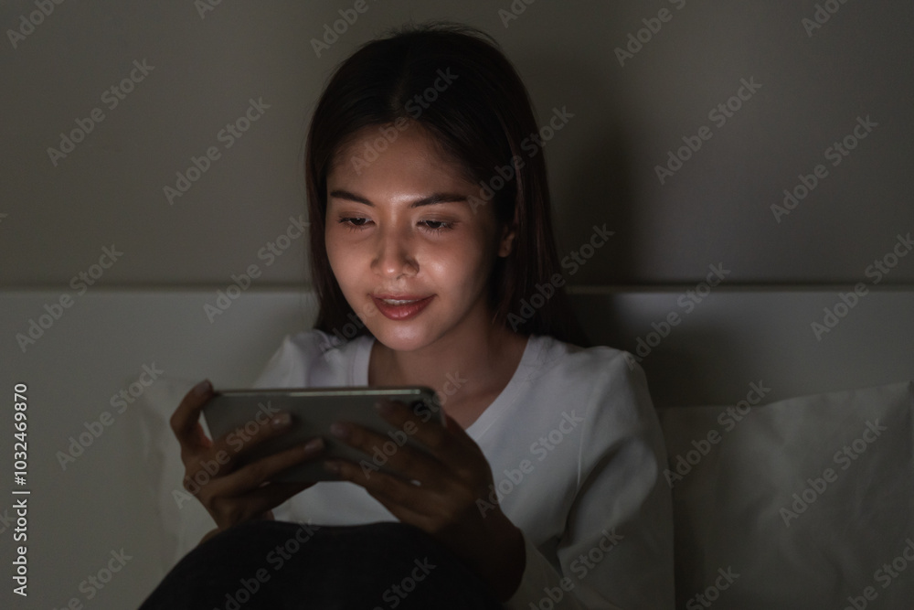 Mobile addiction and insomnia concept, asian young woman using smartphone before sleeping browsing social media, networks reading online news late at night on mobile phone in dark bedroom at home.