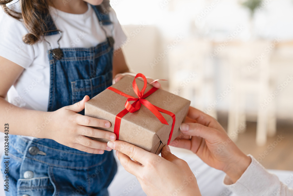 Closeup shot of mother giving receiving birthday Christmas New Year Mother`s day present gift box with red ribbon at home. Family celebration event