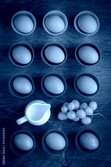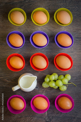 Eggs in colourful cupcake cups with grapes and a milk jar