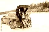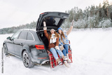 Happy friends in winter forest in the car. Two happy girls sit in the trunk of a car talking and laughing.
