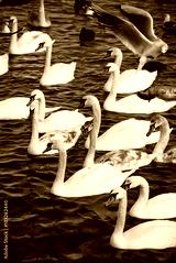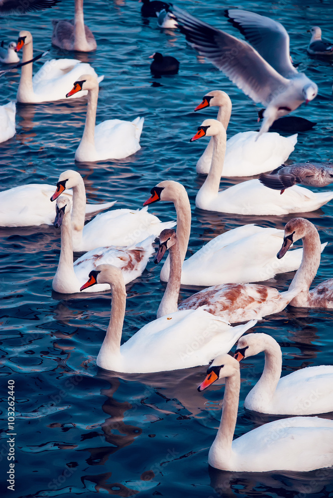 A lot of beautiful swans, seagulls, ducks and other birds in the winter sea at the sunny day.