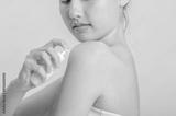 Smiling Woman Holding Skincare Bottles with Eyes Closed in Relaxation