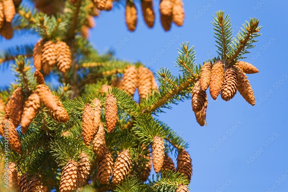 Close up of a green fir cone on a fir tree branch, young fir cone showing a green hue with hints of pink at its tips
