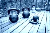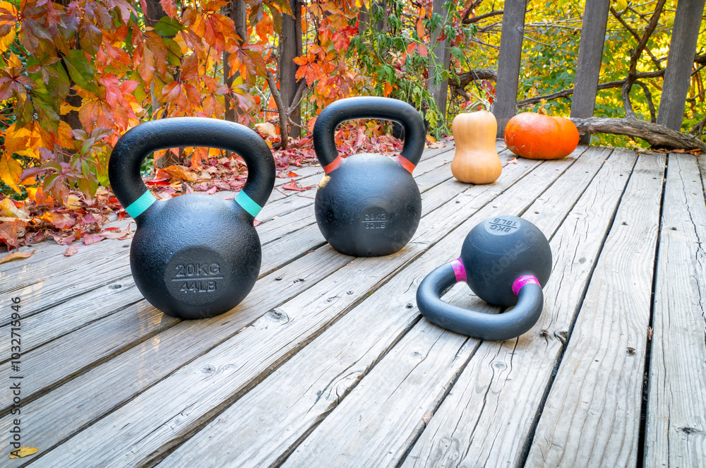 iron kettlebells on a wooden backyard deck in fall scenery with pumpkin
