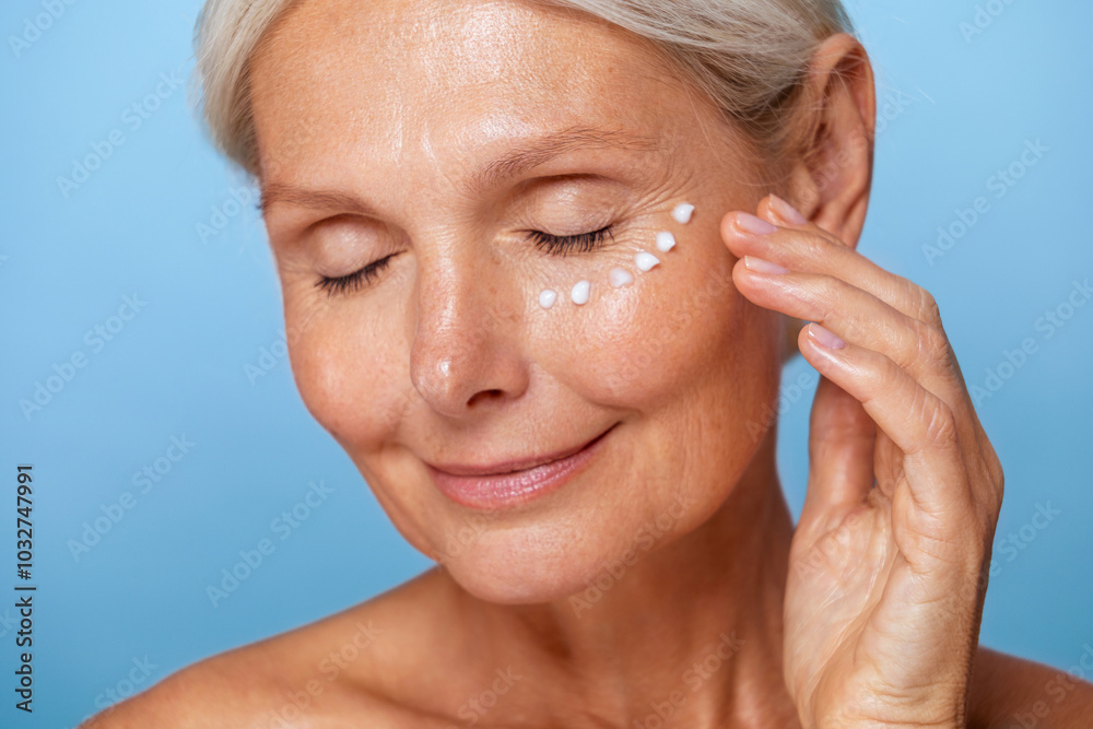 Smiling mature woman with closed eyes applying moisturiser under her eyes, showing a relaxed skincare routine against a blue background...