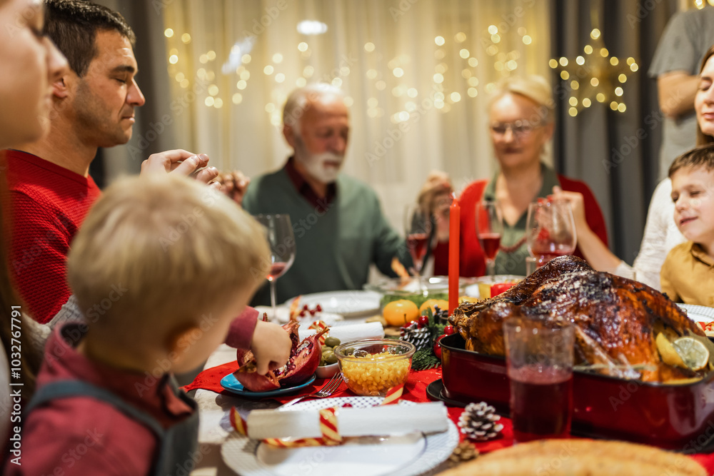 Family praying before eating tasty homemade food. Christmas dinner. Christmas decorations