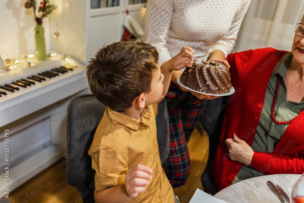 Mother brought tasty cake on the dining table. Family celebrating Christmas.
