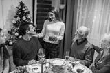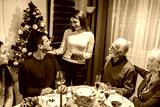 Mother brought tasty cake on the dining table. Family celebrating Christmas.