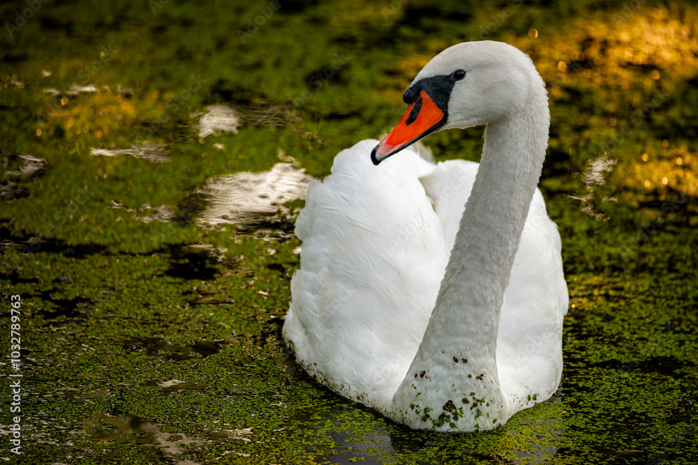 Portret pięknego łabędzia niemego pływającego po leśnym stawie