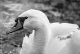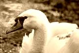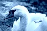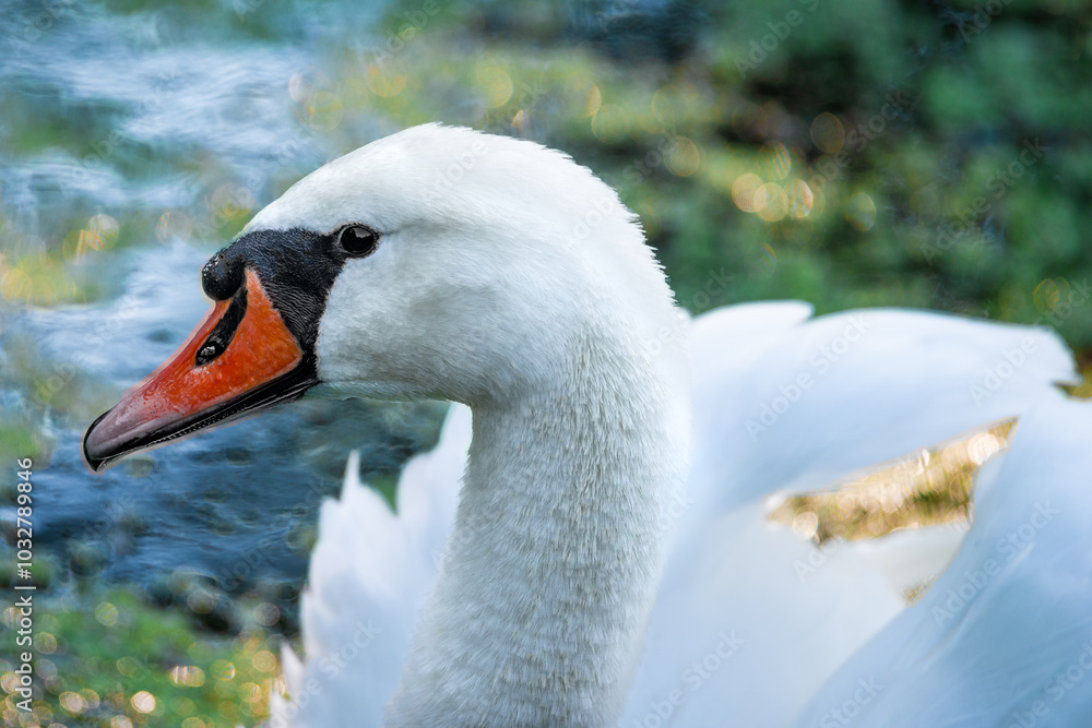 Portret pięknego łabędzia niemego pływającego po leśnym stawie