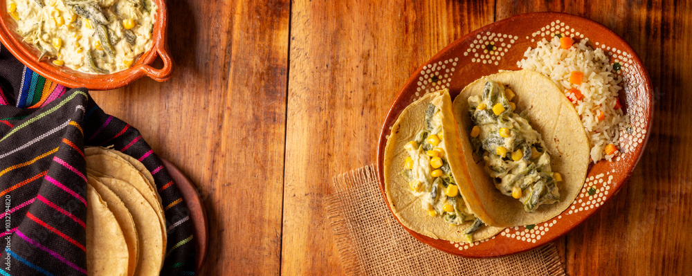 Rajas with Cream. Very popular dish in Mexico that consists of strips of poblano chili with cream, it is served as a garnish or in tacos, it is a typical recipe in Mexican Tacos de Guisado.
