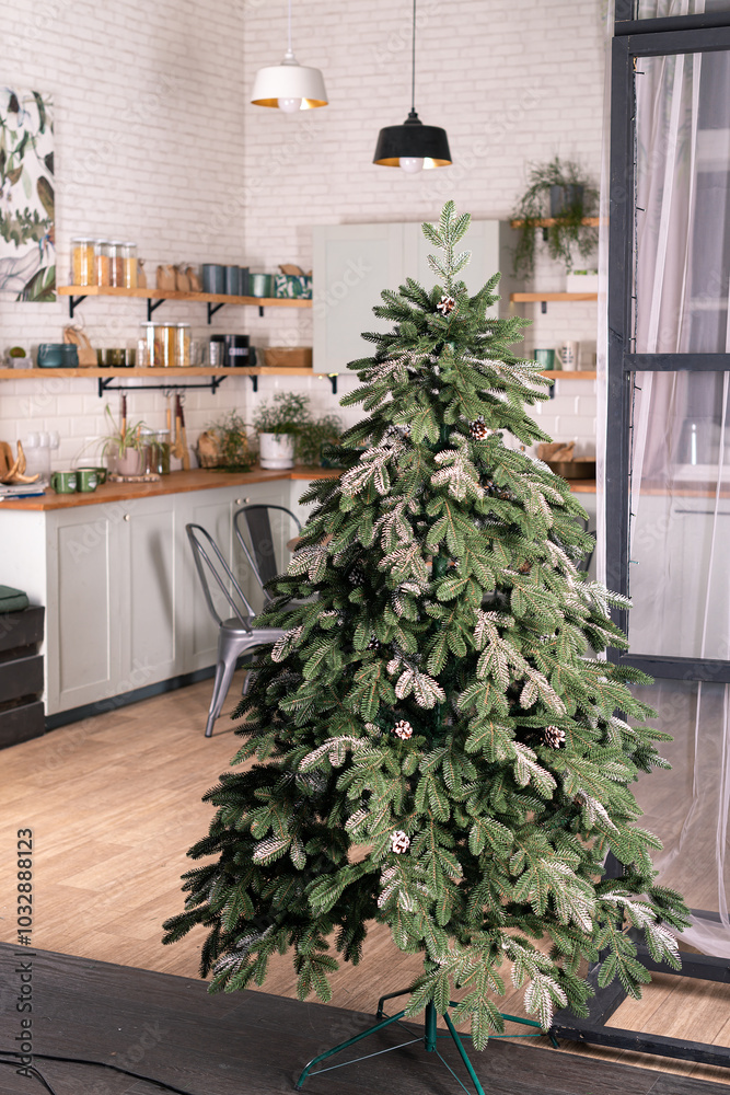 artificial Christmas tree ready to be decorated for the New Year celebration