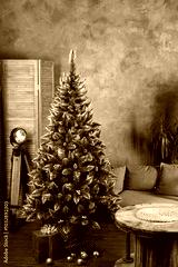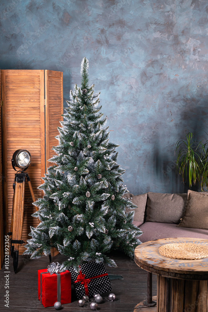 artificial Christmas tree ready to be decorated for the New Year celebration