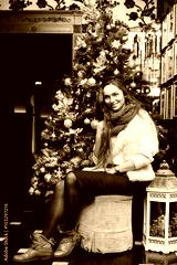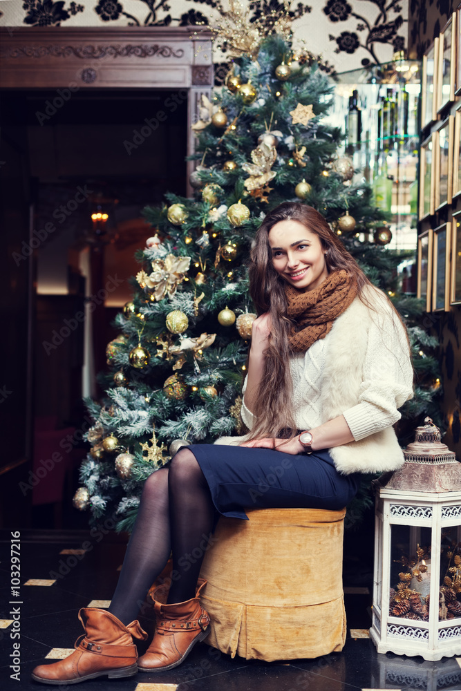 Full body portrait of a young beautiful smiling woman sitting near the Christmas tree. Model looking aside. Toned