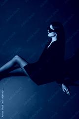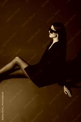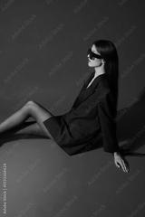 Fashion asian female slim model in black jacket, tights and trendy sunglasses.