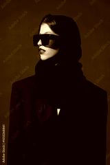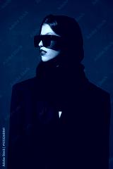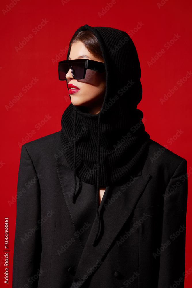 Fashion asian female model in black jacket, balaclava, trendy sunglasses. Red lips, red background.
