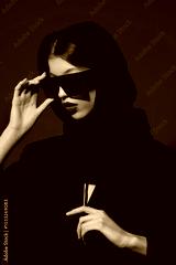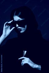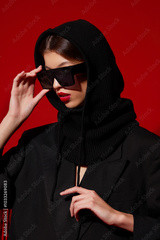 Fashion asian female model in black jacket, balaclava, trendy sunglasses. Red lips, red background.