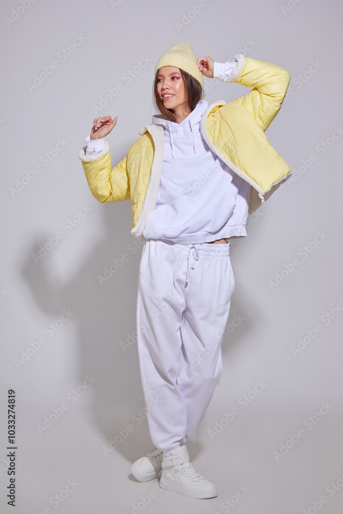 Fashion asian female model in white sport suit, sneakers, yellow hat and down jacket.