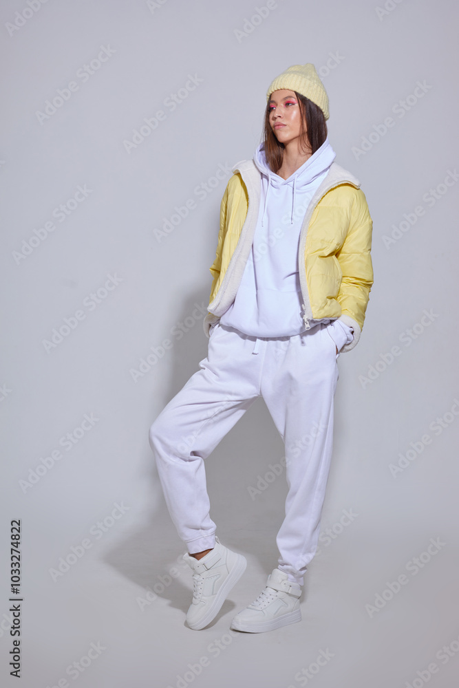 Fashion asian female model in white sport suit, sneakers, yellow hat and down jacket.