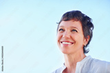 Mature, woman and thinking smile on blue sky for holiday, travel or vacation in retirement. Confidence, mockup and space with happy tourist person outdoor in summer for peace, sightseeing or wellness