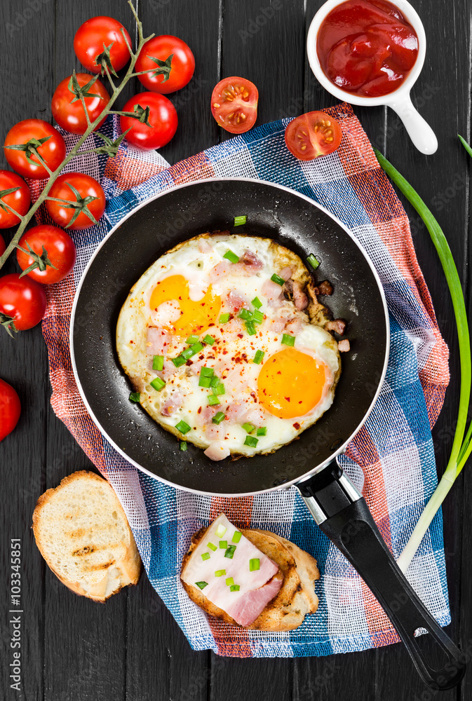 Fried eggs with ham and onion