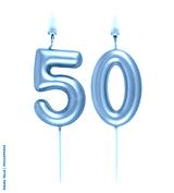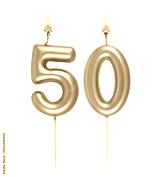 Burning pink birthday candles isolated on white background, number 50