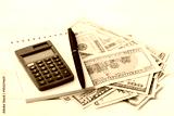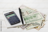 Calculator, notebook, pen and cash money on white table. Finance concept.