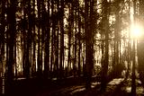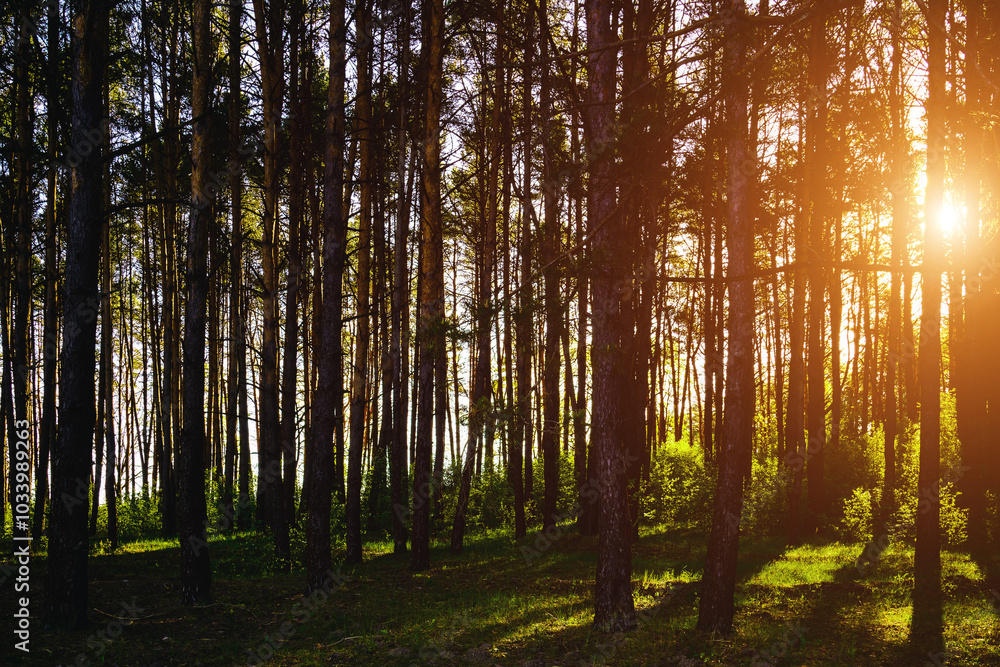 Sunbeams streaming through the pine trees and illuminating the young green foliage on the bushes in the pine forest in spring. Vintage film aesthetic.