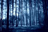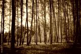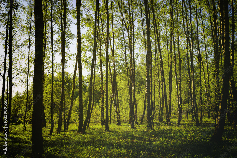 Sunset or sunrise in a spring birch forest with bright young foliage glowing in the rays of the sun and shadows. Vintage film aesthetic.