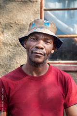 african village, portrait single smiling african man, mid adult in front of his house in the township
