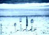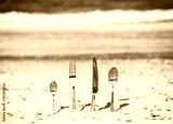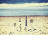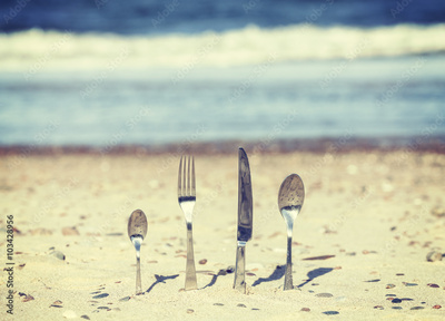 Retro toned cutlery stuck in sand on the beach, shallow depth of field