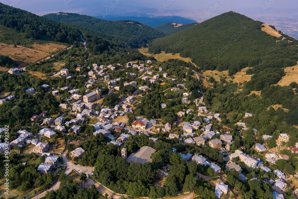 An aerial view of Nymfaio, a picturesque mountain village in Greece