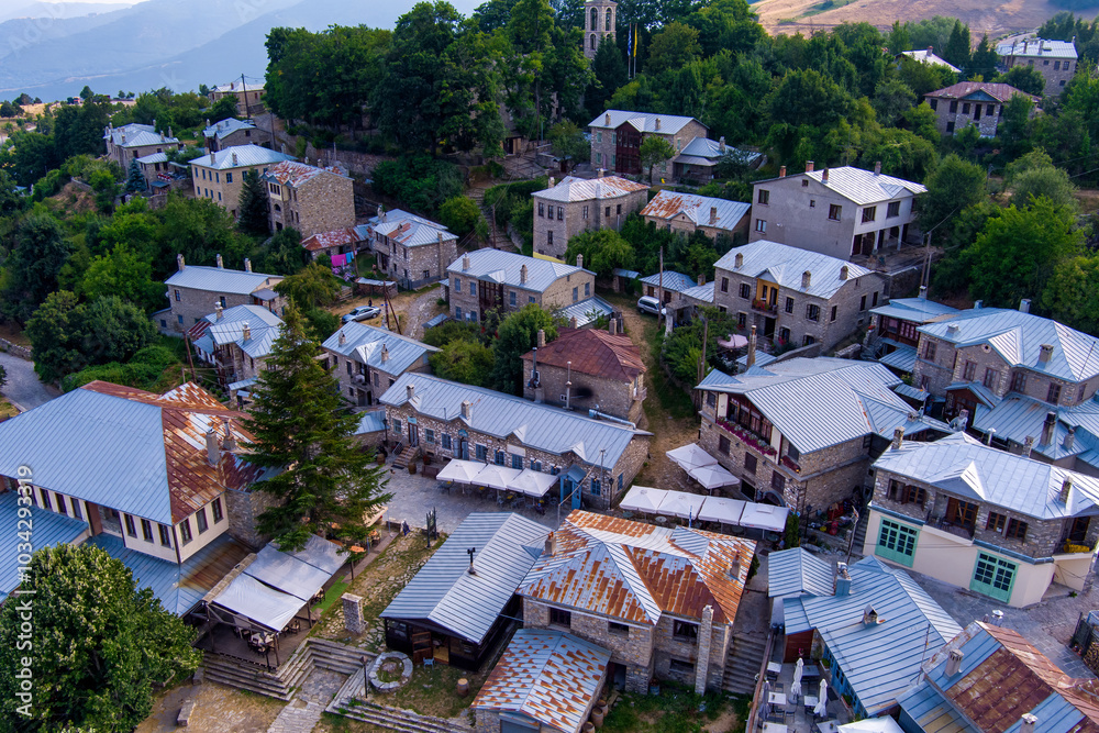 An aerial view of Nymfaio, a picturesque mountain village in Greece