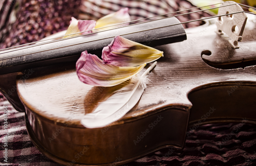 Still life with vintage violin and petals. Closeup of old wooden violin.Stringed music instrument on abstract background