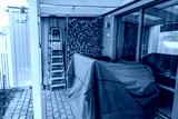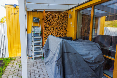 Winter preparation at villa with stacked firewood and covered outdoor furniture. Sweden.