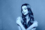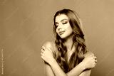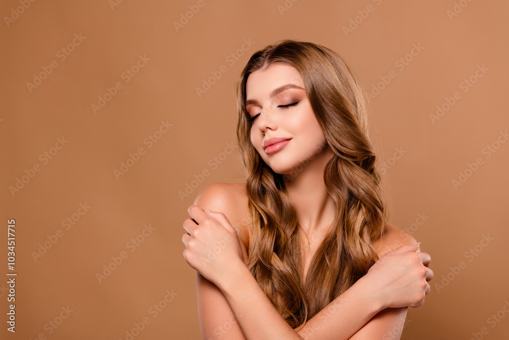 Photo of dreamy charming girl hugging herself nude silky shoulders isolated on beige color background