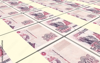 Algerian dinar bills stacks background. Computer generated 3D photo rendering.